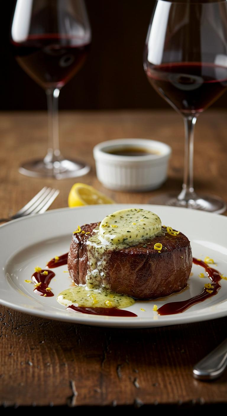 - While the meat rests, make the truffle butter: mix softened butter, truffle oil (or grated truffle), minced garlic, parsley, and lemon zest until smooth.