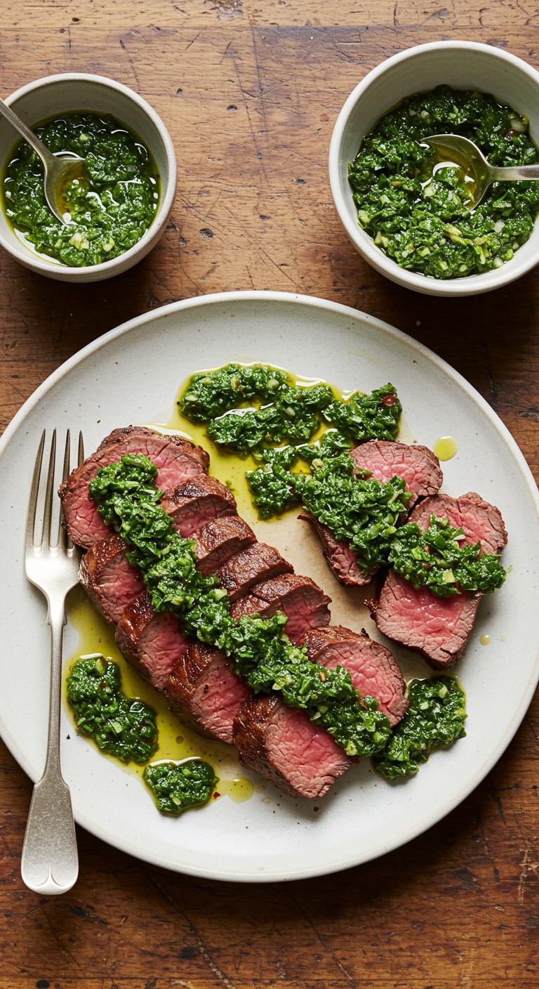 Enjoy the bright, garlicky kick of chimichurri cutting through rich, tender beef — perfect for a lively dinner.