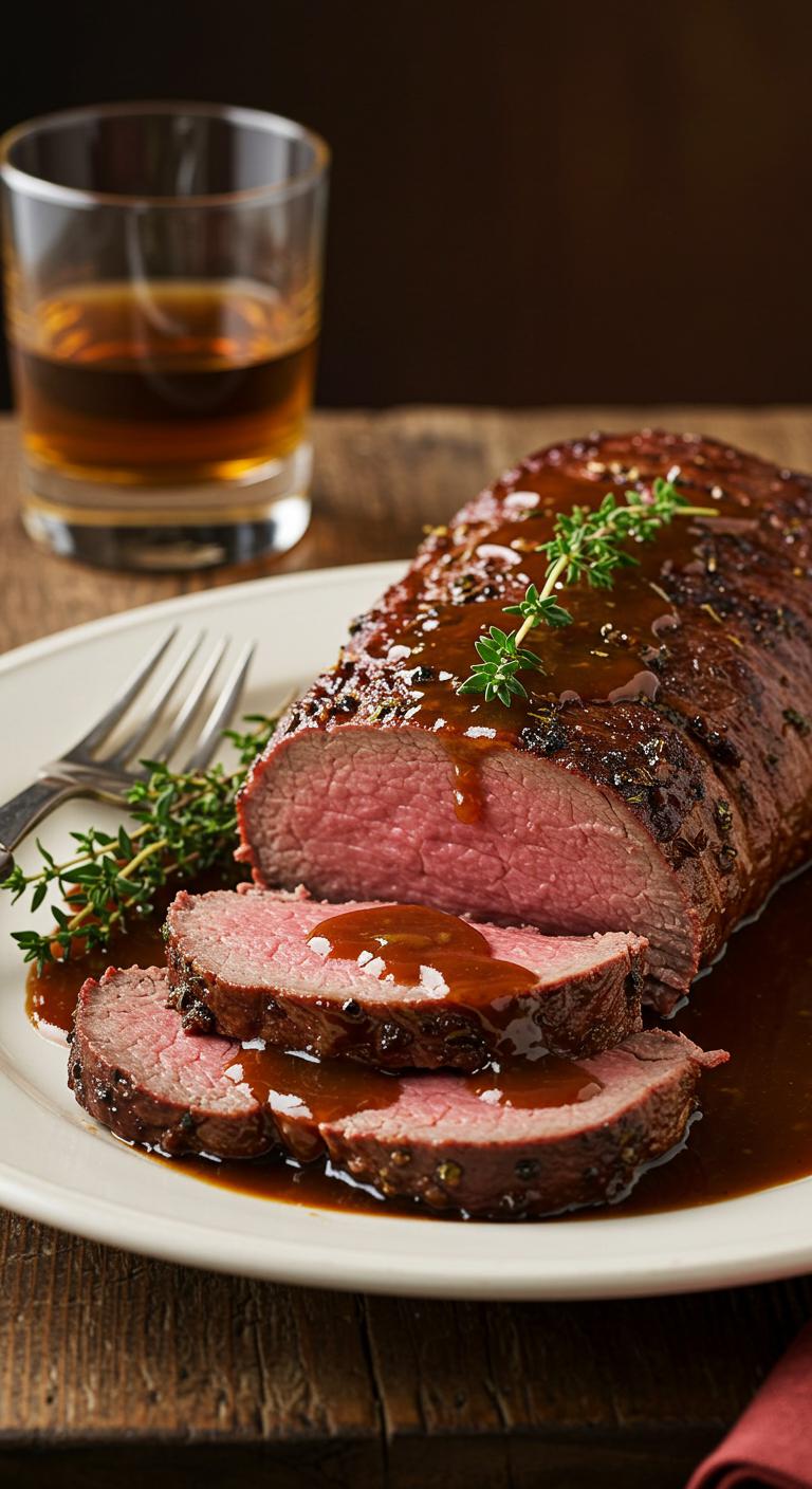 - Slice the tenderloin into medallions, spoon the bourbon-molasses glaze over the slices, and garnish with fresh thyme or parsley.