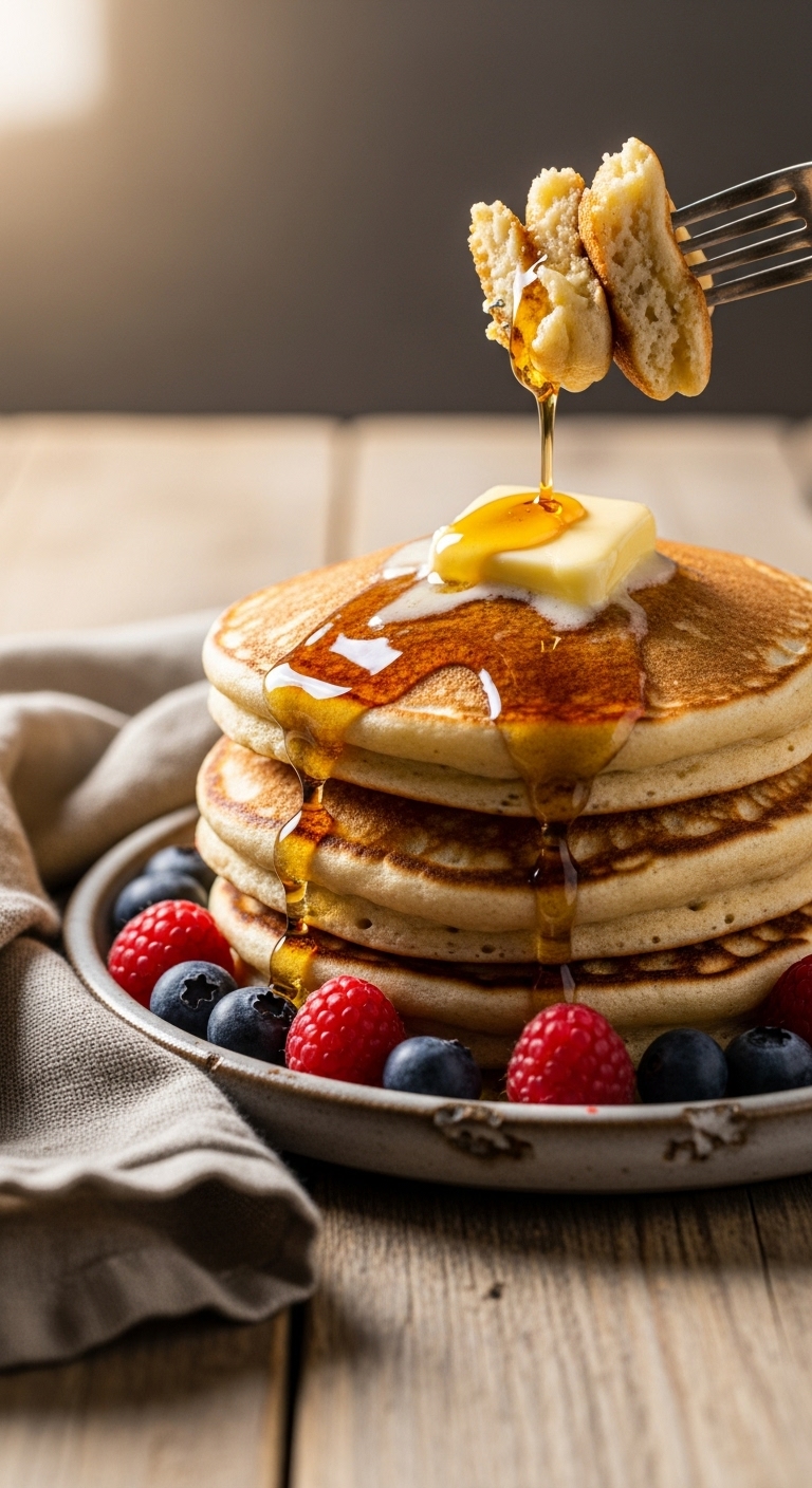 Stack pancakes and add butter, maple syrup, and fresh berries. Sprinkle powdered sugar or chopped nuts. Pair with coffee, tea, or orange juice. Refrigerate leftovers up to 2 days, reheat in a skillet or toaster oven. Batter can be made the night before and stored covered in the fridge.