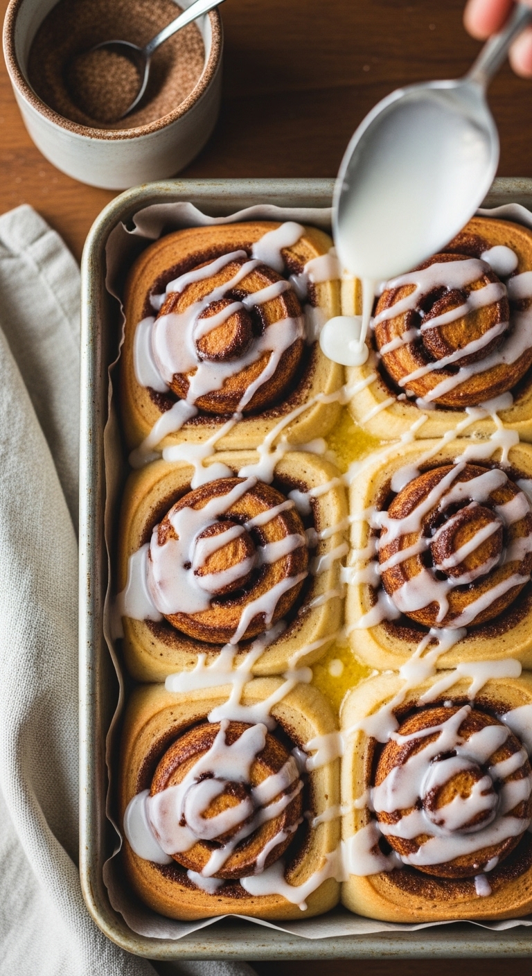 - Glaze and cool: Beat glaze ingredients and drizzle over warm rolls. Let cool 10 minutes before serving.