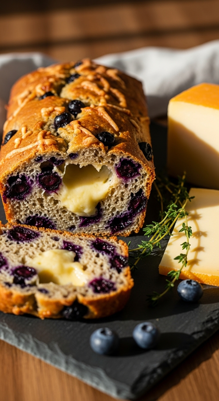 This savory-sweet loaf pairs sharp cheddar with sweet blueberries. Cheese creates pockets of savory richness. The contrast is striking and fun in lunch boxes. It’s great for grilled cheese sandwiches with jam. You’ll get cheesy aroma and tangy berry notes.