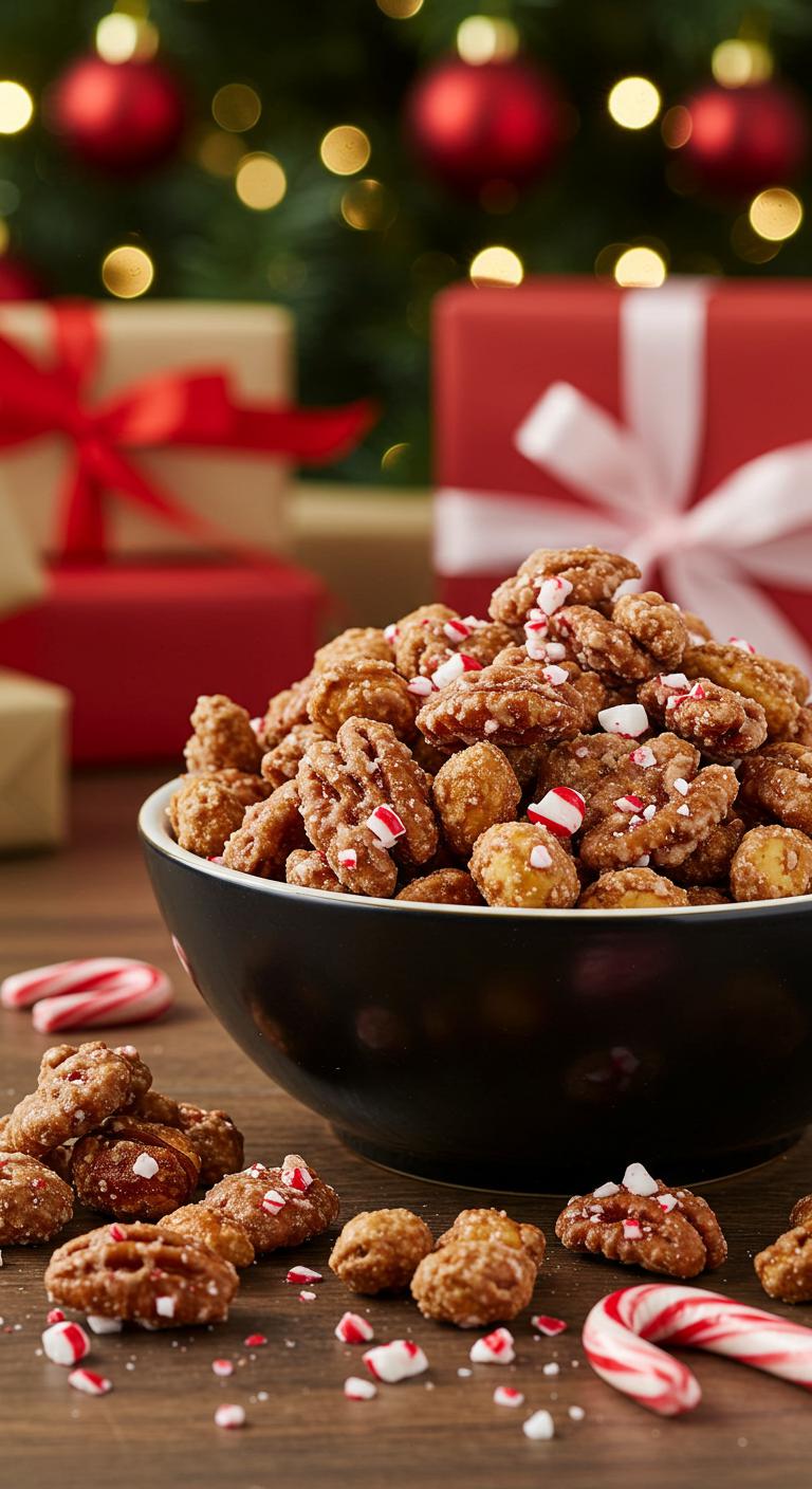 A crunchy, festive snack of roasted nuts tossed in a sweet peppermint glaze—perfect for gifting or nibbling by the tree.