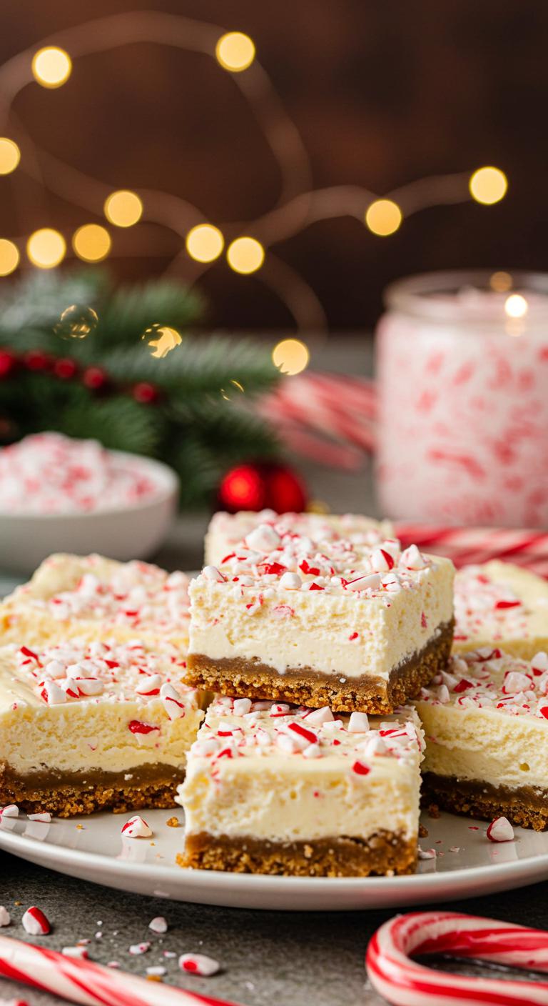 Enjoy cool, minty bites — these cheesecake bars are sweet, creamy, and candy-cane-crunch perfect for any holiday spread!