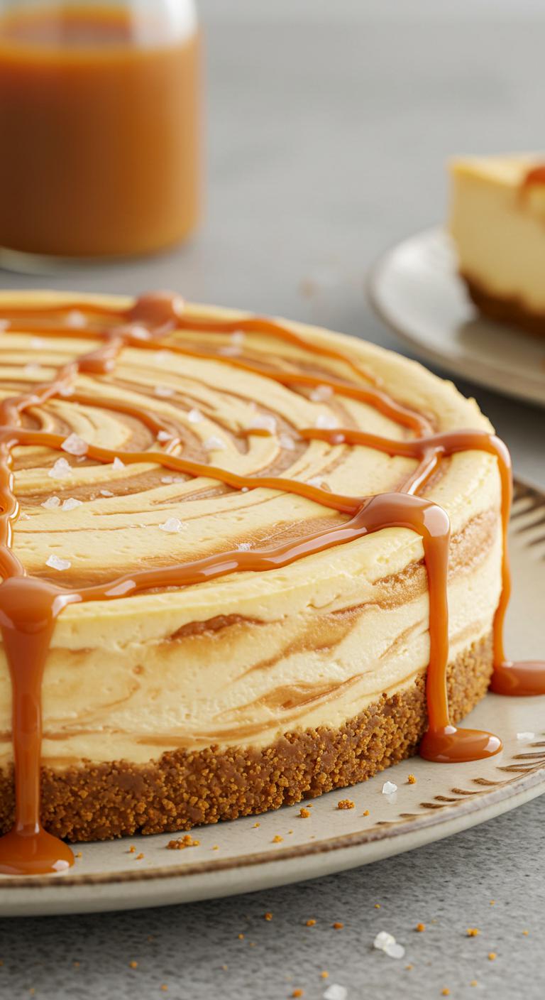 Creamy caramel ribbons through a rich cheesecake—decadence in every silky bite.