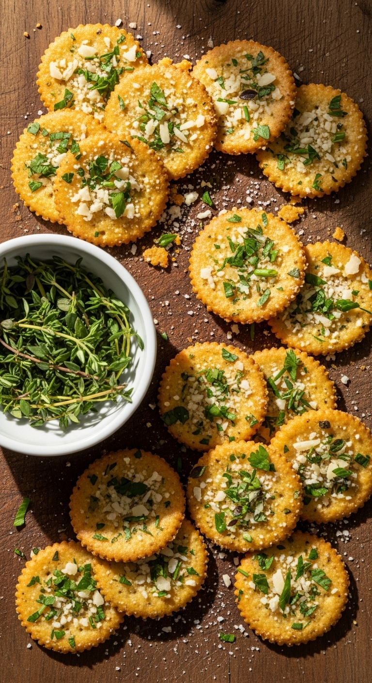Parmesan and cheddar create layered umami in these herb-forward crackers. Fresh herbs add green flecks and an aromatic lift. The texture is crisp and slightly crumbly, with savory depth. These are ideal on a cheese board or with soup.