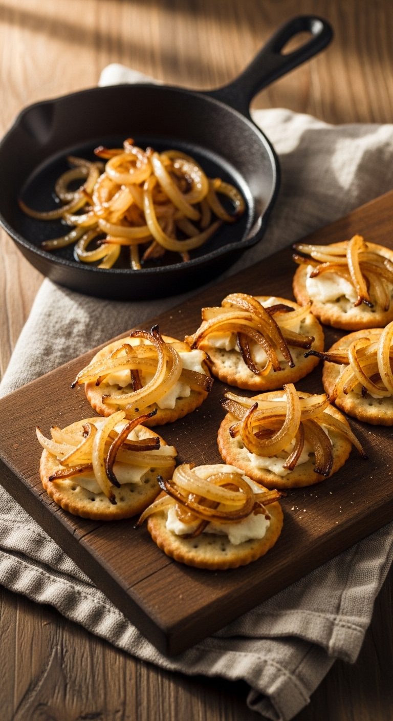 Sweet, deeply savory caramelized onions pair beautifully with sharp cheddar. The onions add chew and sticky sweetness that bakes into the cracker. These are rich and aromatic. They shine on a cheese board or with roasted vegetables.