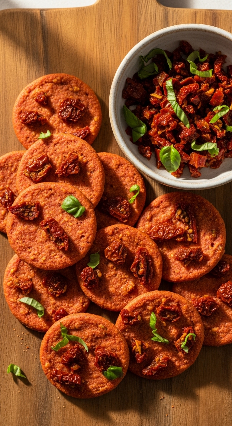 Tangy sun-dried tomatoes and basil bring Mediterranean flair to these cheddar crackers. The tomato pieces add chew and concentrated flavor. The crackers brown evenly and have a slightly rustic look. They’re perfect with soft cheeses and olives.