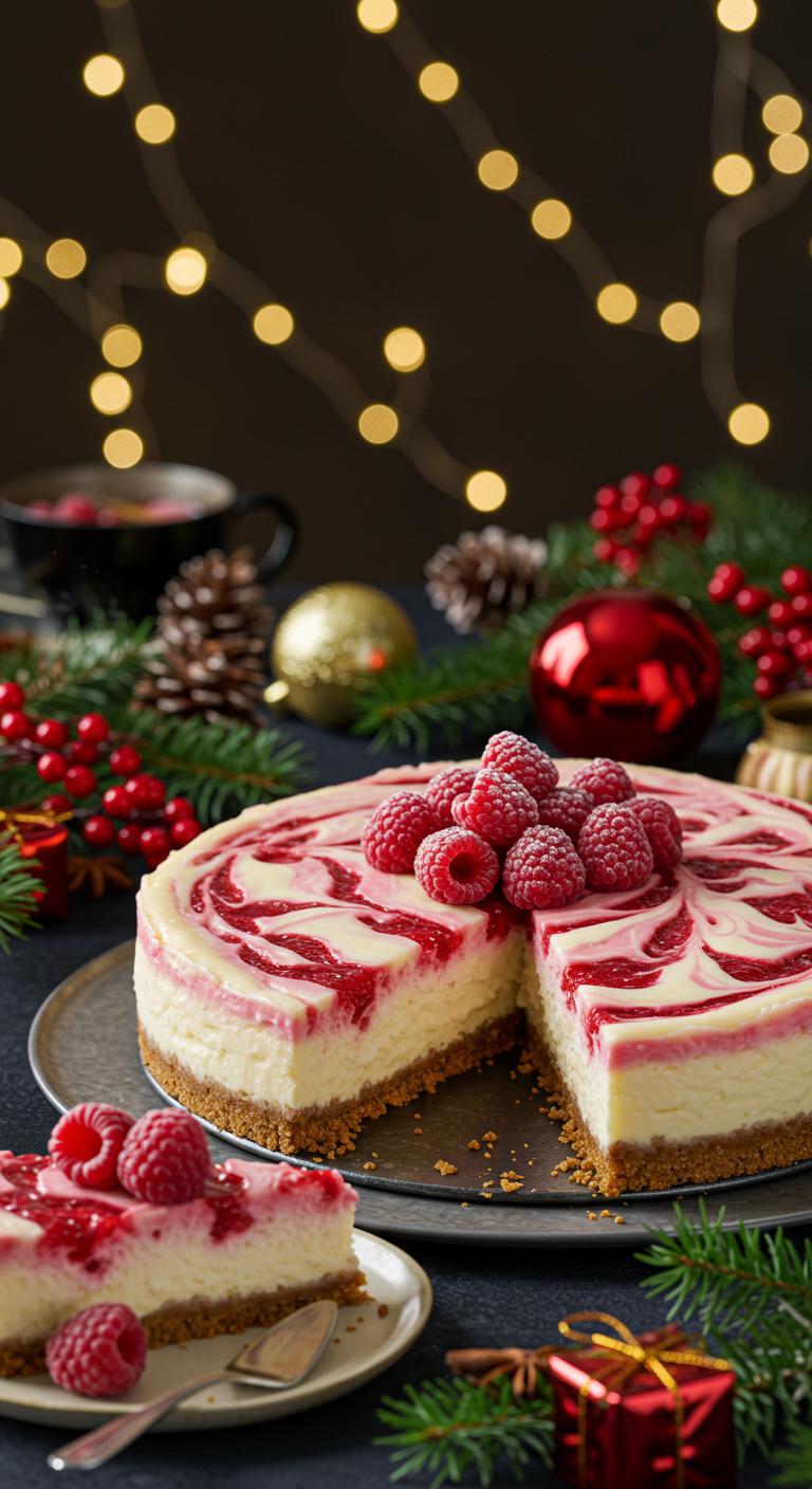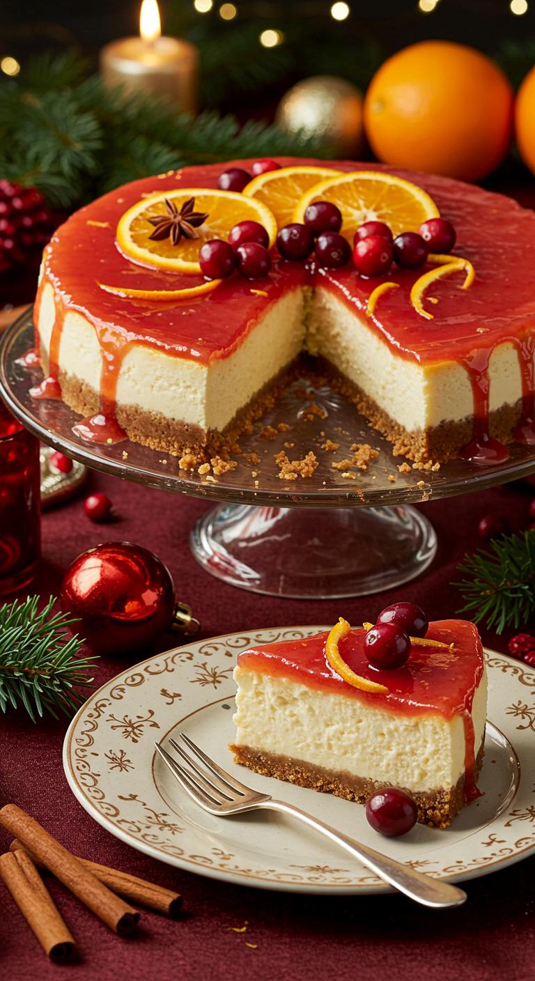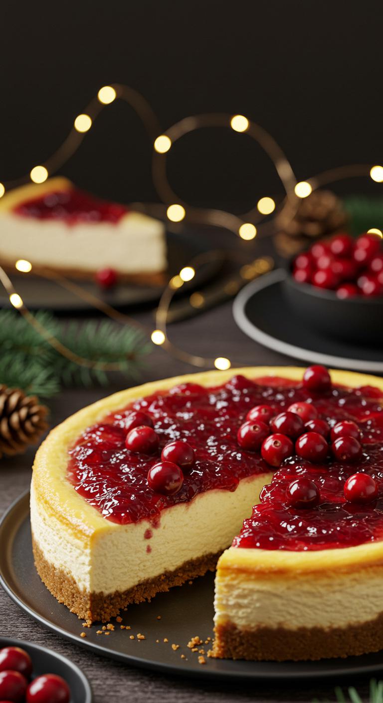 A luxuriously creamy New York–style cheesecake topped with bright cranberry compote—perfect for a festive centerpiece.