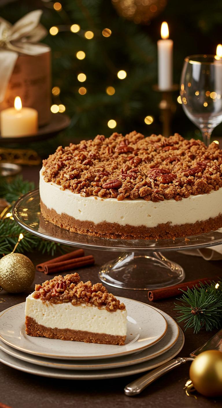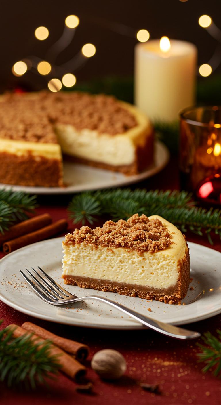 Creamy eggnog cheesecake with a spiced nutmeg crumble — holiday comfort in every bite.
