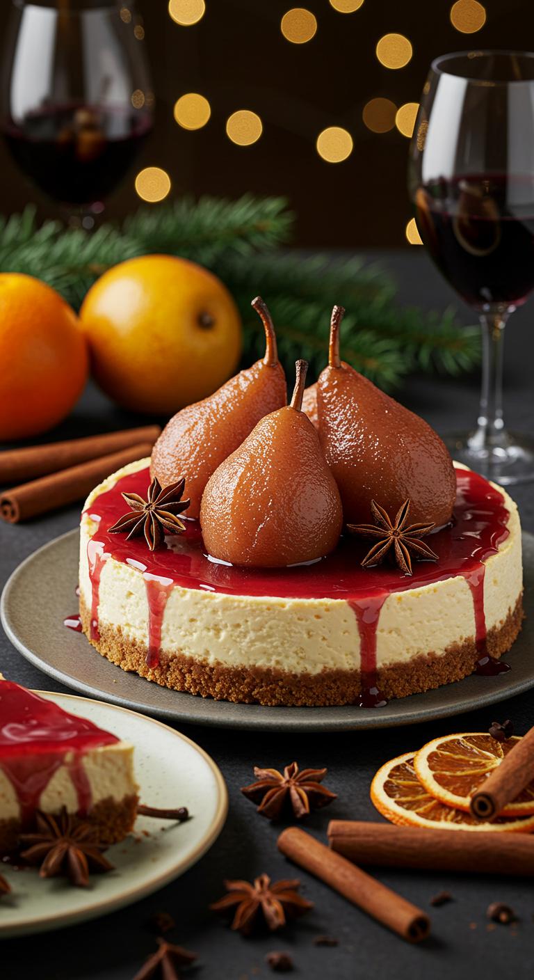 - When ready to serve, drizzle the reduced mulled wine sauce over the cheesecake and garnish with a light dusting of cinnamon or a few reserved star anise for drama.