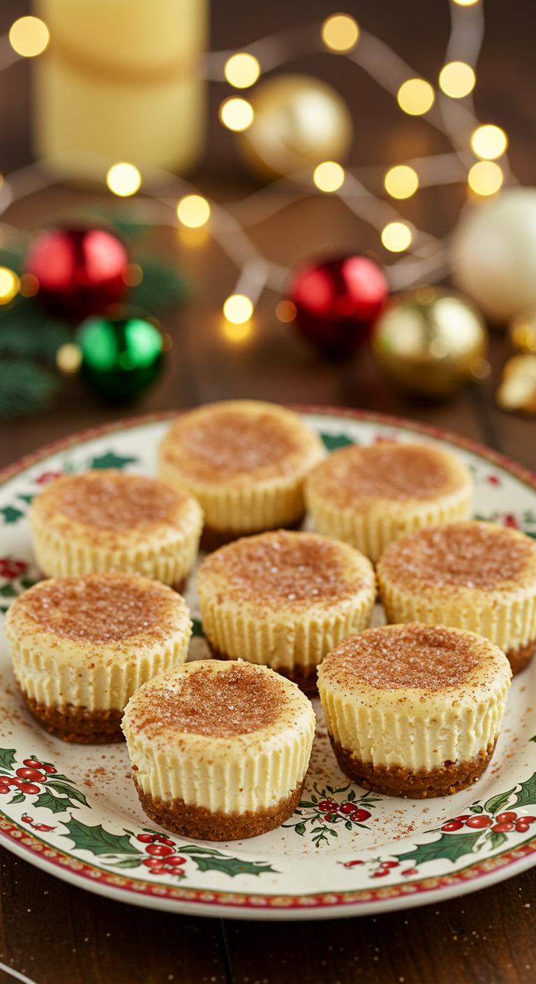 A festive little bite of creamy eggnog cheesecake dusted in cinnamon sugar — perfect for holiday parties.