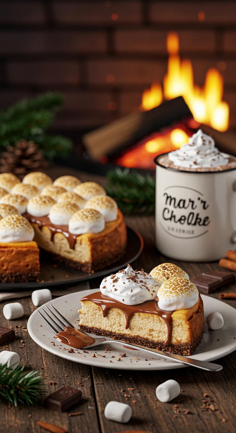 Toasted Marshmallow and Hot Chocolate Cheesecake — think cozy campfire sips turned into a slice of dessert heaven.
