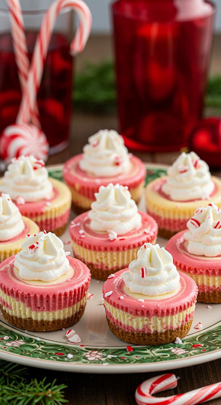 Bright, festive mini cheesecakes swirled with peppermint for a merry, bite-sized holiday treat.