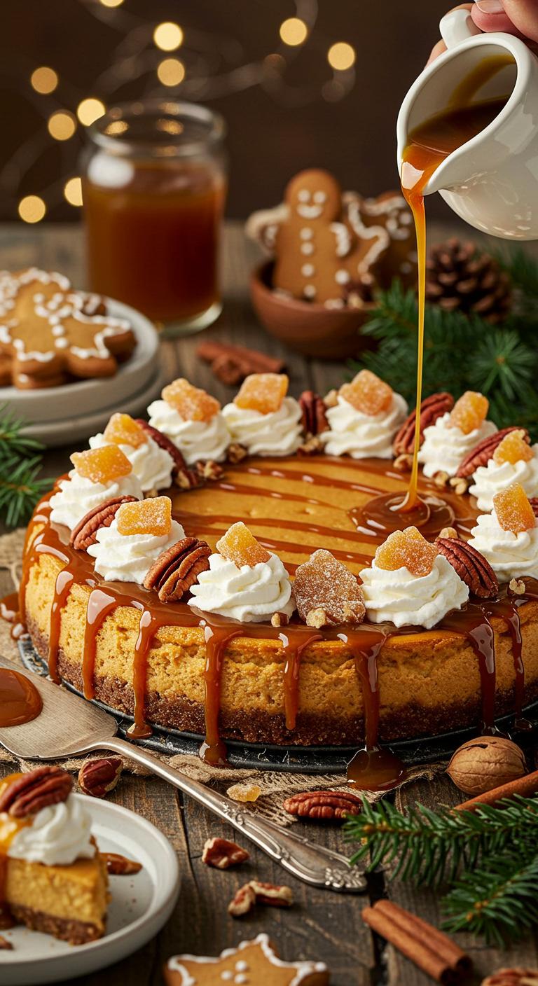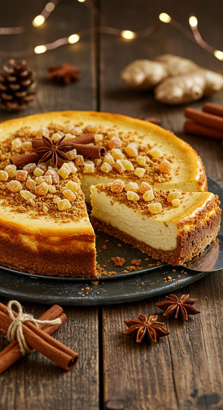 A cozy, spiced cheesecake with a gingerbread crust and warm molasses drizzle — perfect for holiday gatherings.