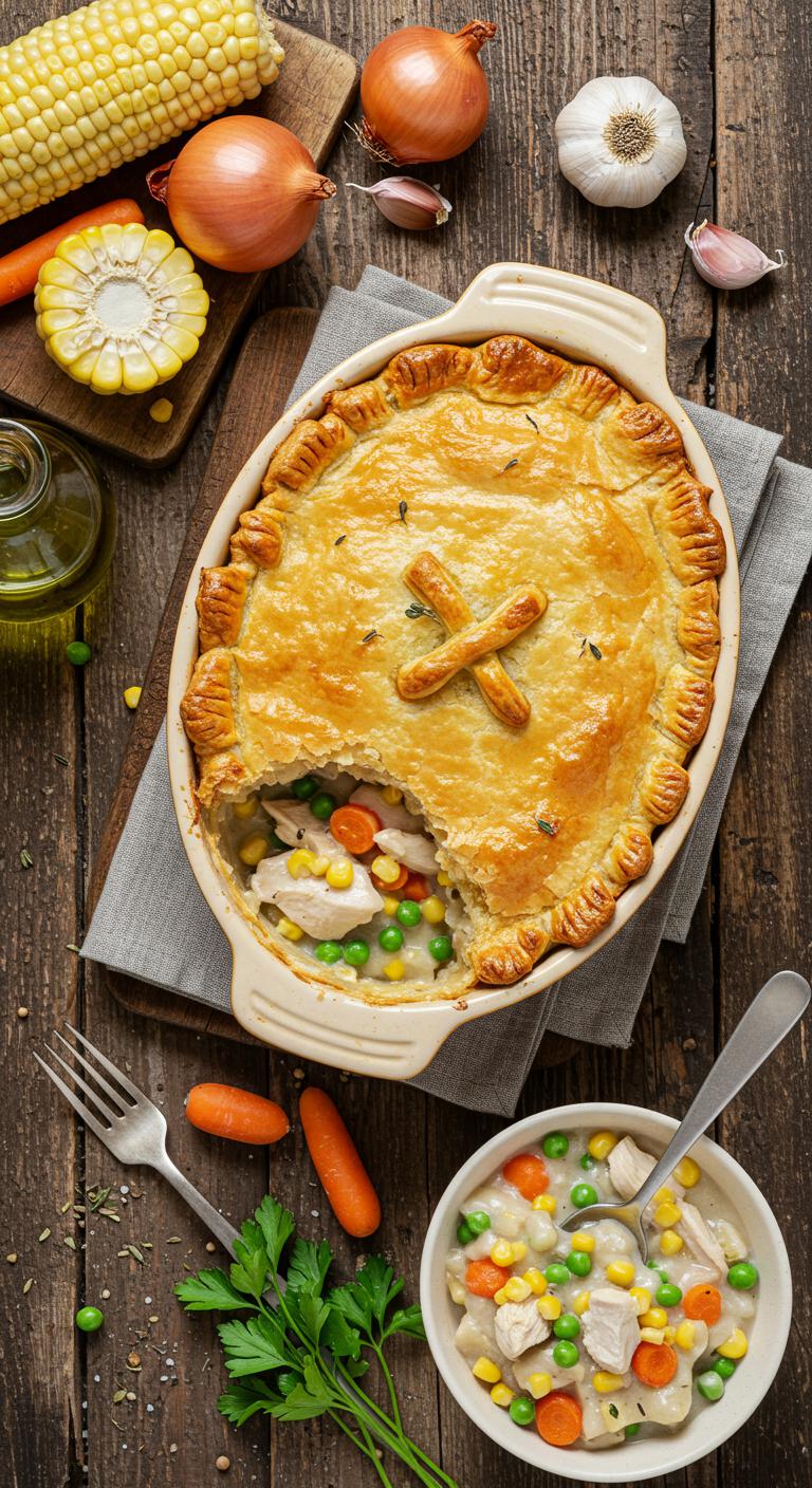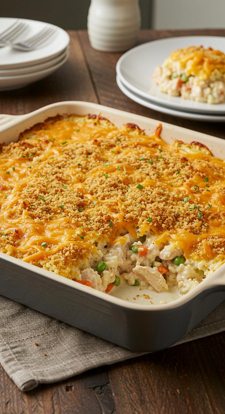 A cozy, comforting chicken pot pie casserole with a golden, flaky topping — all the flavor of pot pie without the fuss.