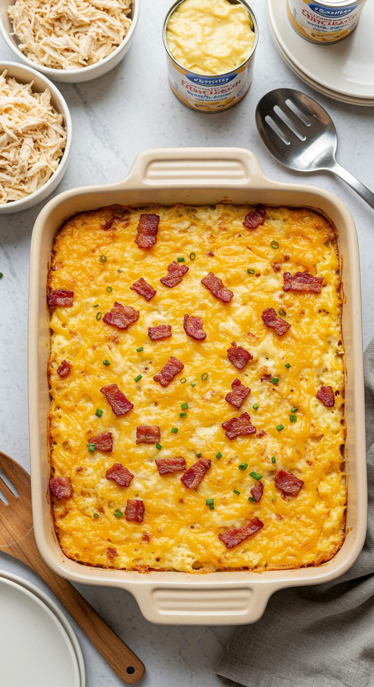 Cheddar and Bacon Chicken Hashbrown Casserole — a cozy, cheesy comfort bake that’s perfect for family dinners or weekend brunch.