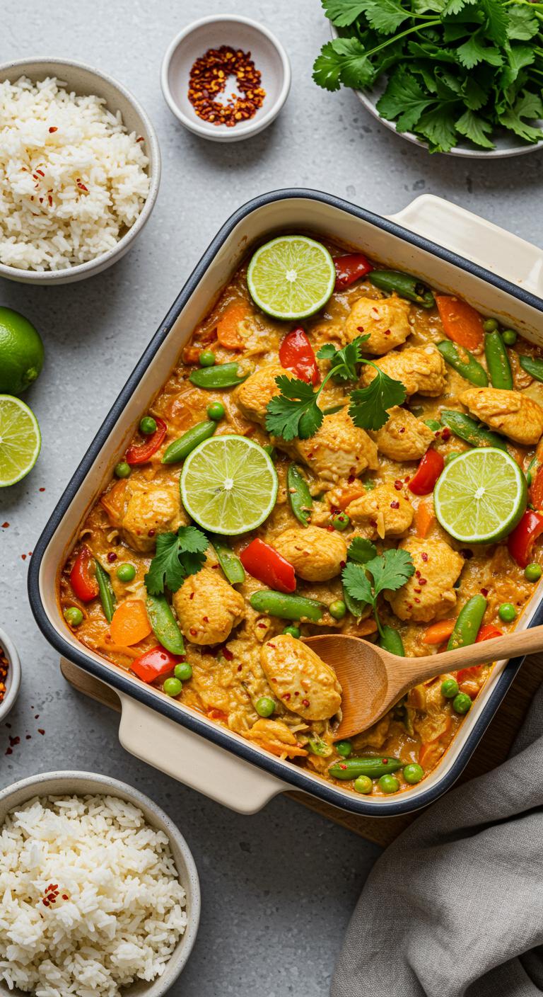 Bright, creamy Thai coconut curry chicken baked into a cozy, comforting casserole with fragrant herbs and a little kick.