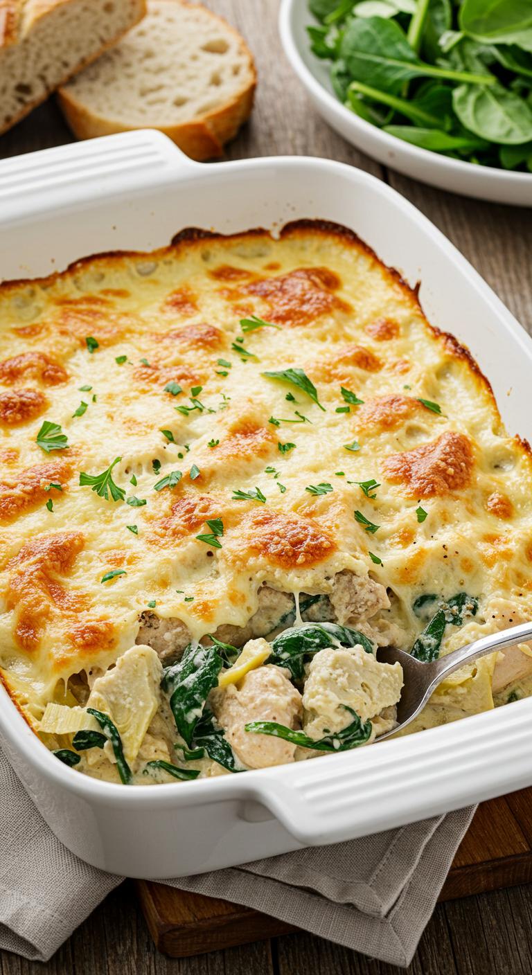 - Bake uncovered for 20–25 minutes until bubbling and the chicken is cooked through (internal temp 165°F / 74°C).
