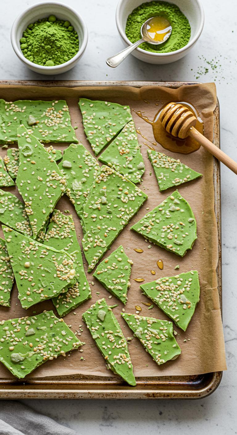 Bright, elegant matcha-white chocolate bark studded with nutty toasted sesame for a crunchy, tea-scented treat.