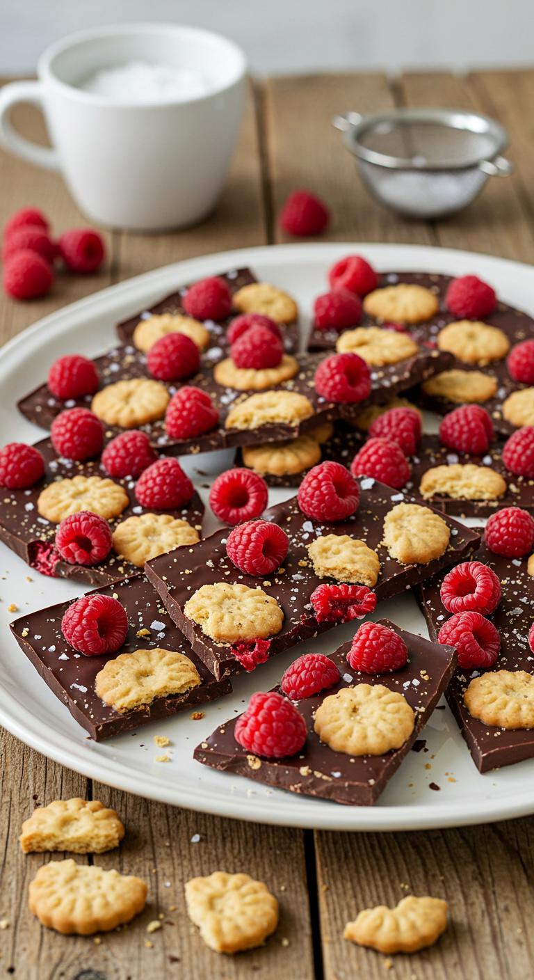 A tart-and-sweet dark chocolate bark studded with bright raspberries and buttery shortbread — simple, elegant, and irresistible.