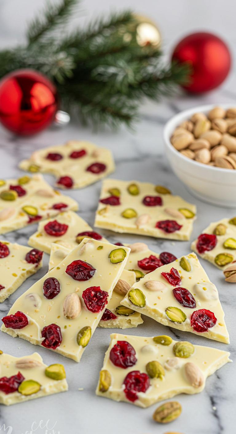 Bright, festive white-chocolate bark studded with tart cranberries and crunchy pistachios.