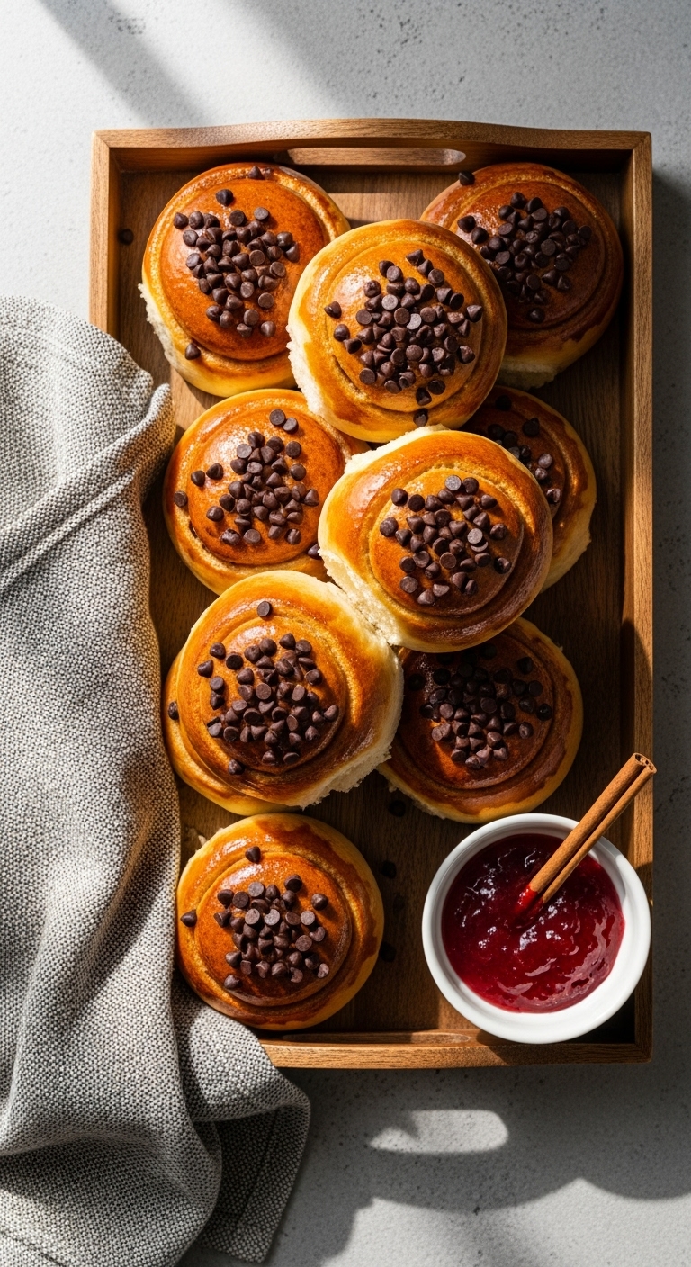Serve warm, brushed with melted butter. Offer small bowls of jam or mascarpone for spreading. Pair with hot chocolate or milk for kids, and coffee for adults. Store in an airtight container 2 days at room temp or freeze baked rolls for up to a month. Reheat briefly to revive melty chocolate.