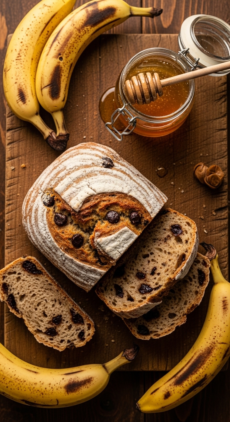 This loaf pairs overripe bananas with sourdough tang and melty chocolate. It’s moist and cake-like, with banana sweetness balanced by slight acidity. Texture is soft and dense but not gummy. You’ll love it as a dessert or sweet breakfast that uses ripe fruit and your starter discard.