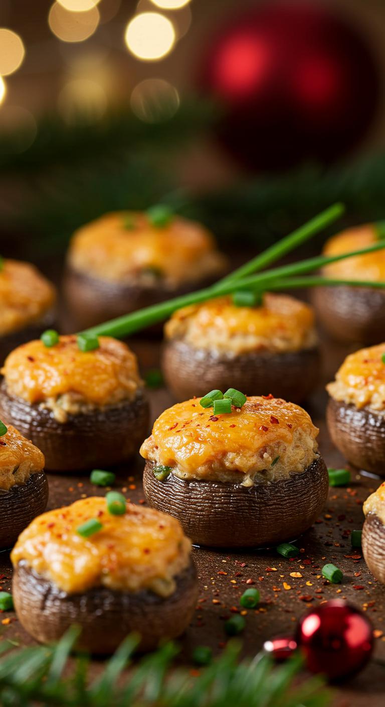 Mini Cheddar and Chive Stuffed Mushrooms — bite-sized, cheesy holiday pops with a crispy air-fried finish.