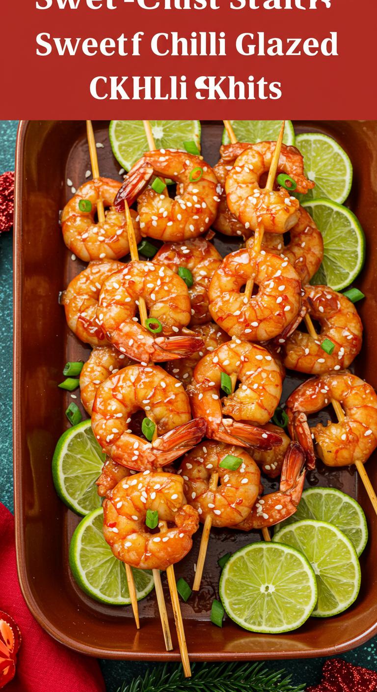 Enjoy these sweet chili glazed shrimp skewers — crisp, saucy, and perfect for holiday snacking!
