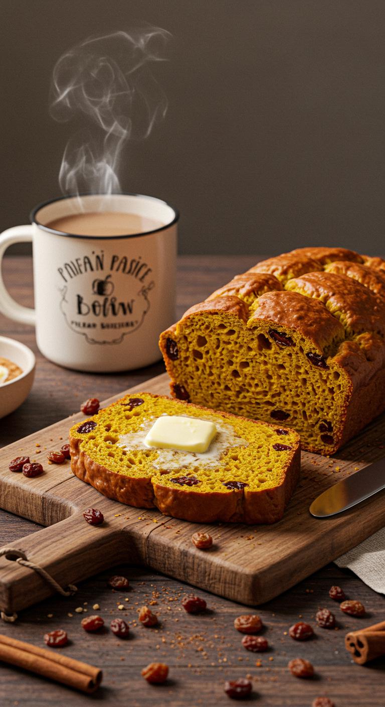 Warm, cozy slices of pumpkin spice raisin bread — perfect with butter and a hot mug.