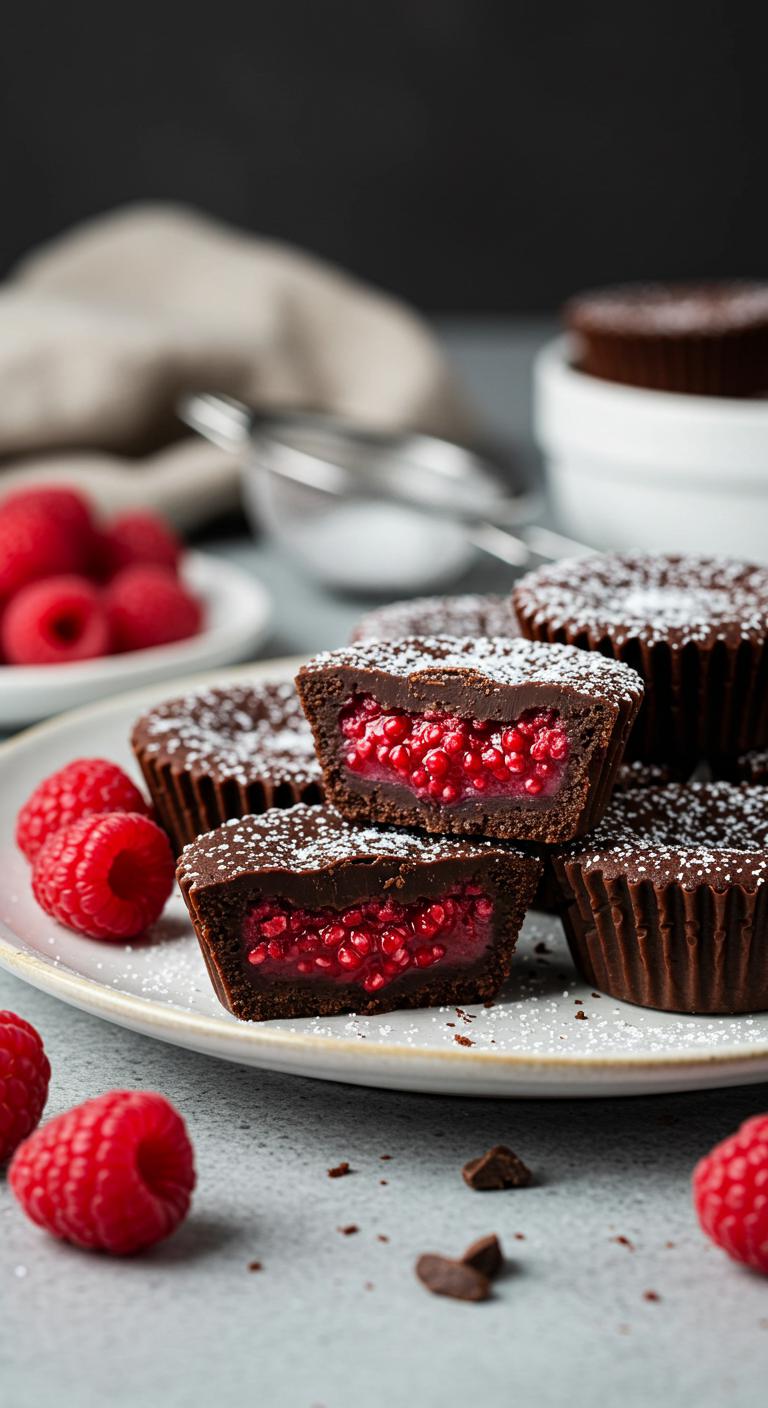 Decadent dark chocolate cups filled with a bright raspberry center — fudgy, fruity, and perfect for gifting.