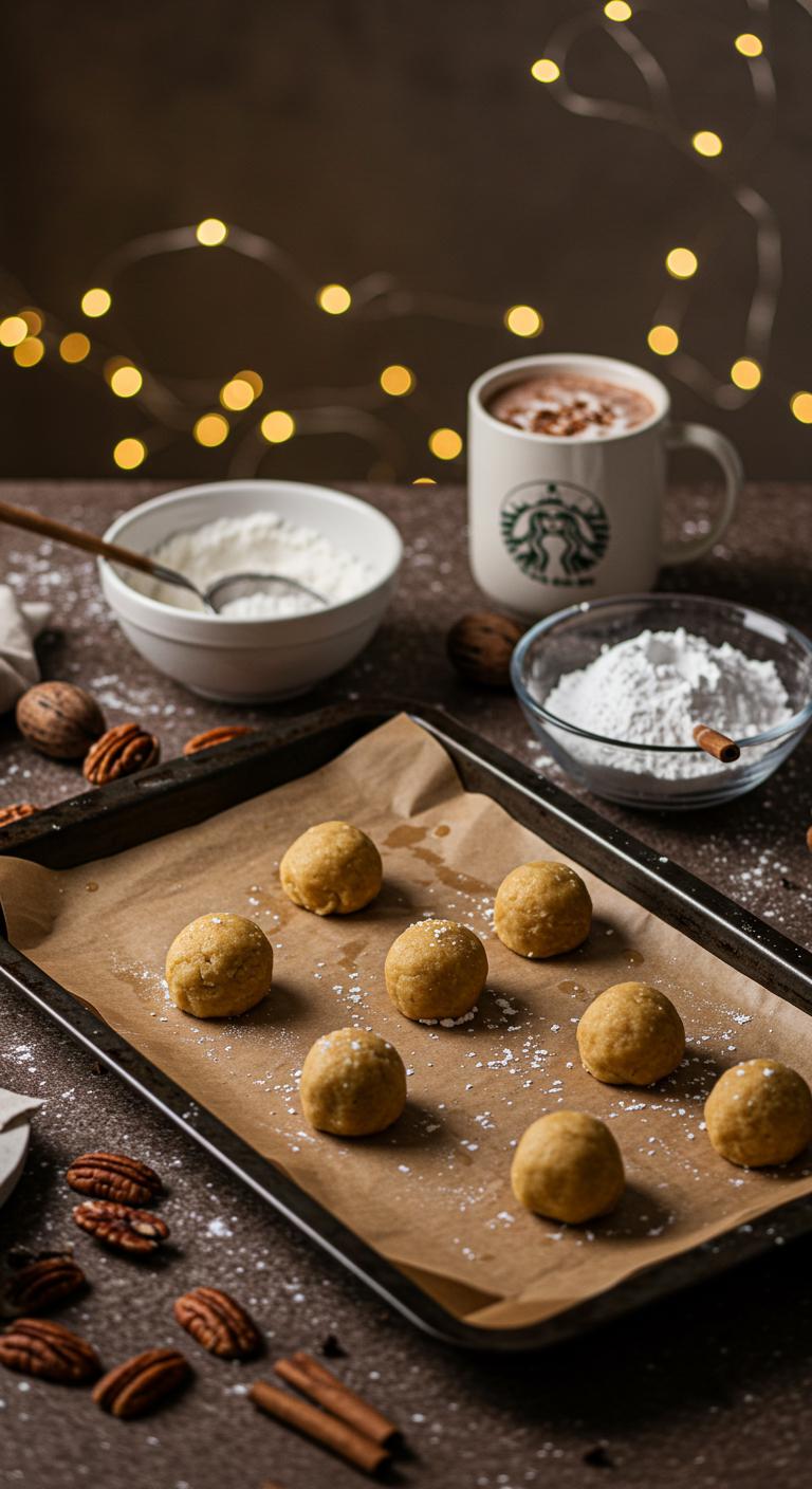 - Once chilled, scoop tablespoon-sized balls of dough and roll them into balls, then roll each ball in powdered sugar until well coated.