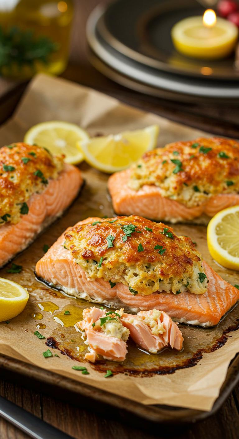 Crab-Stuffed Baked Salmon — a festive, flaky centerpiece with a rich, savory crab filling that’s as elegant as it’s easy.