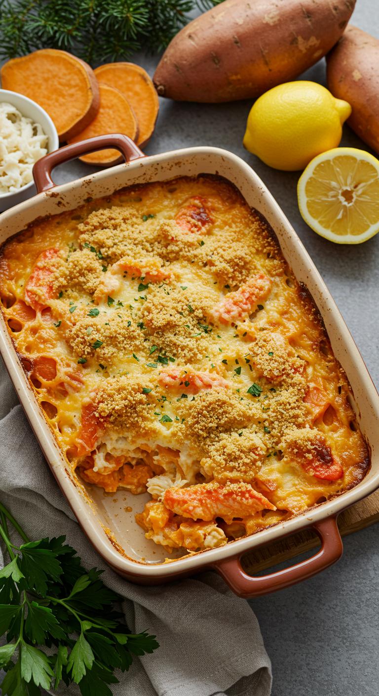Dig in and enjoy a warm, festive gratin that pairs sweet potatoes with succulent crab — comfort with a celebratory twist!