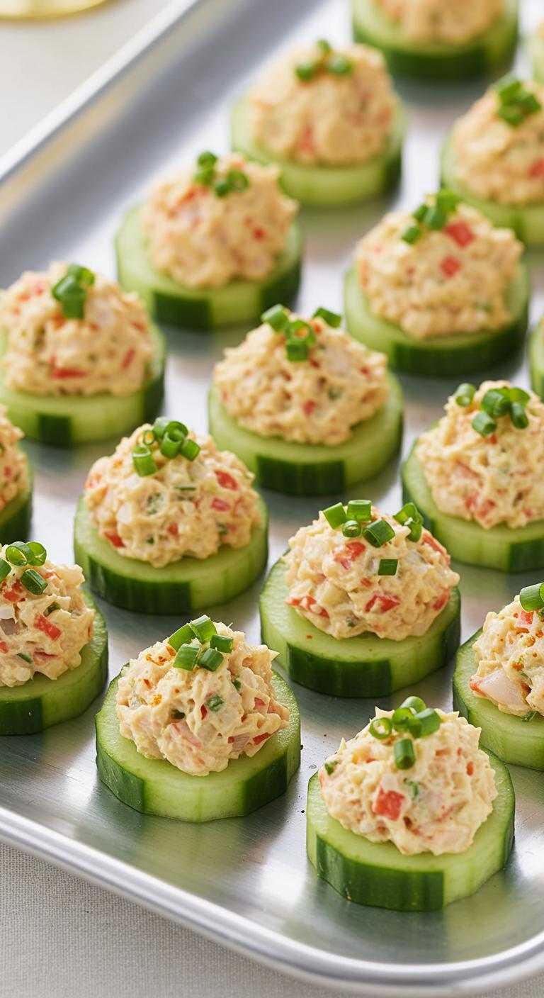 - Spoon about 1 tablespoon of the crab mixture onto each cucumber slice, mounding it slightly.