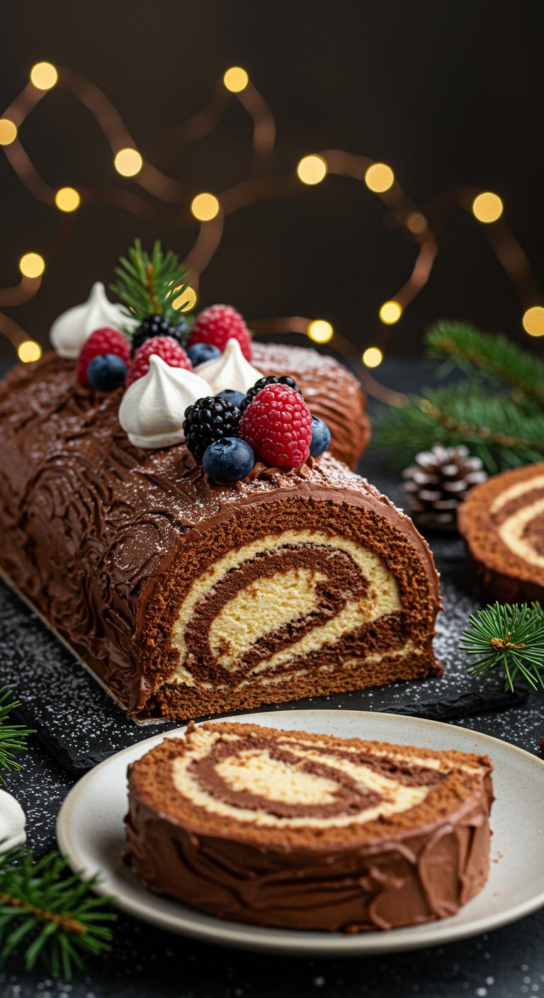 - Use a fork to create bark-like texture in the ganache and dust lightly with powdered sugar. Add berries or meringue mushrooms for a festive touch.