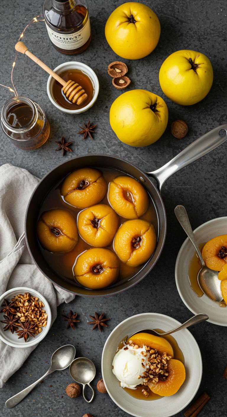 A cozy, spiced dessert of tender quinces poached in a warming hot-toddy syrup — perfect with cream or ice cream.