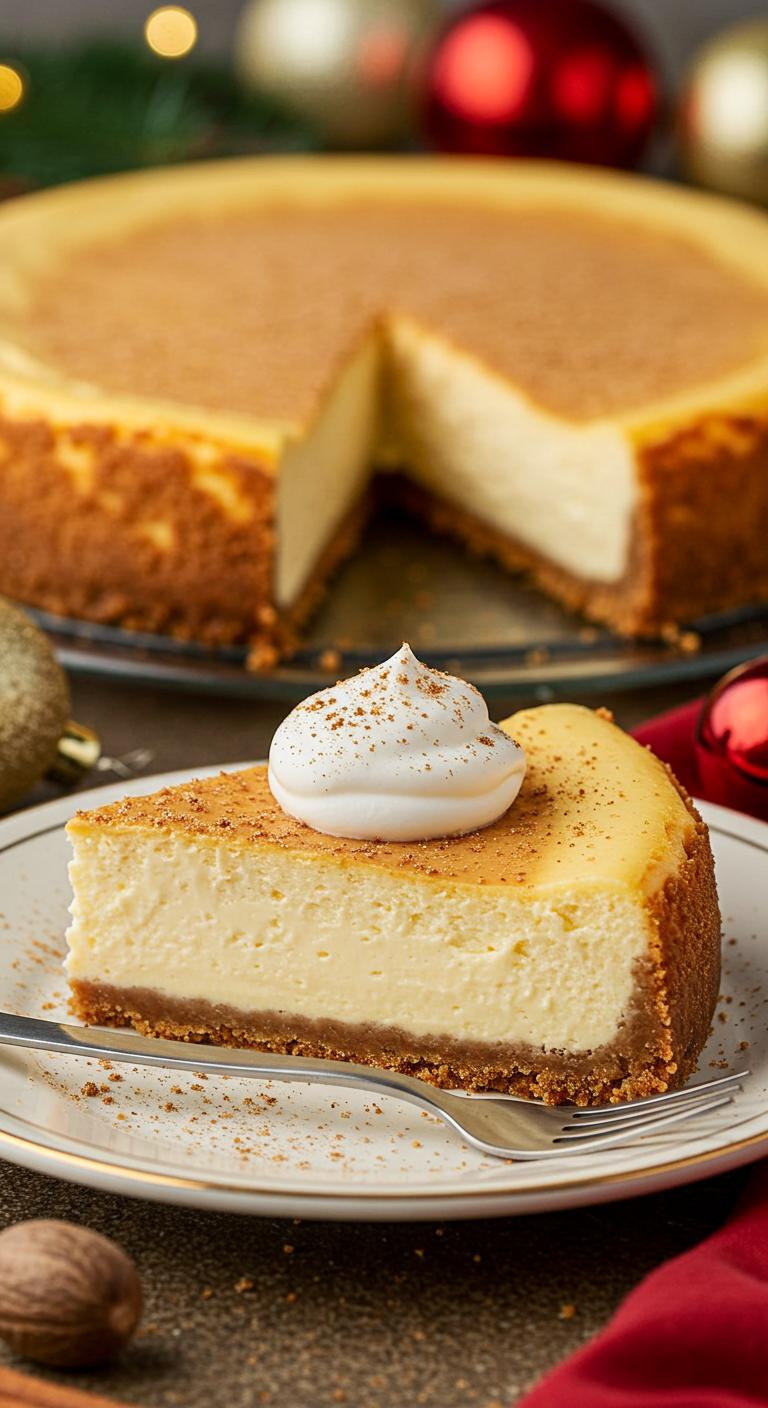 Creamy, spiced eggnog cheesecake on a crunchy gingersnap crust — holiday comfort in every slice.
