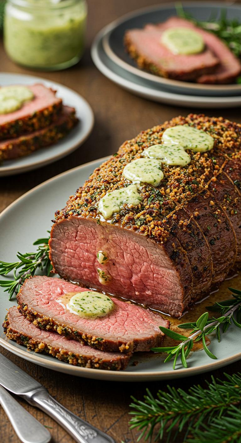 Herb-Crusted Roast Beef With Garlic Butter — a juicy, keto-friendly centerpiece with a crunchy herb crust and rich garlic butter.