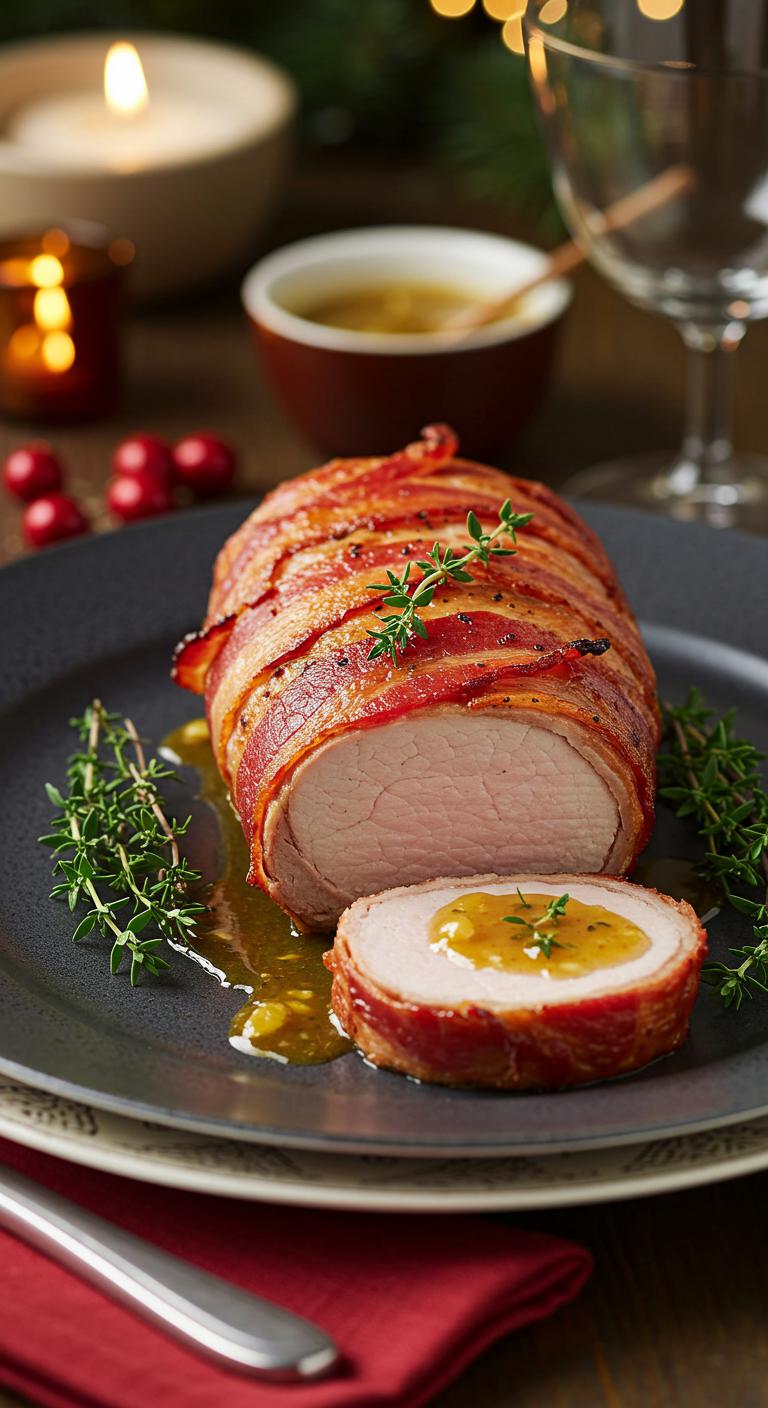 A savory, festive pork main that’s crispy, juicy, and wrapped in bacon with a tangy Dijon finish.
