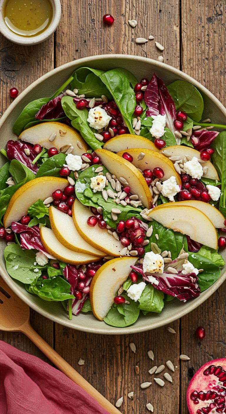 - Add the sliced pears, pomegranate arils, and thinly sliced red onion to the greens.