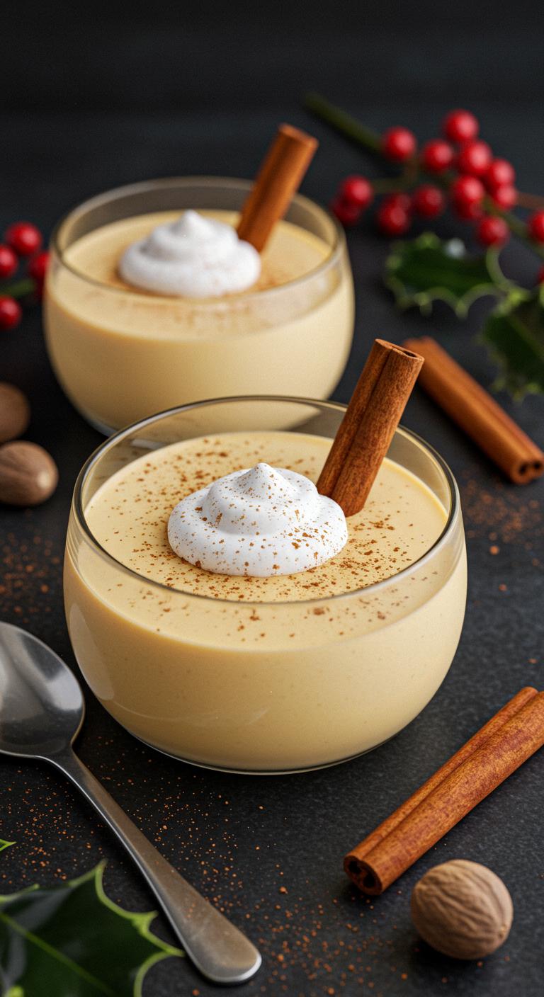 Note: For a fully vegan version, use plant-based eggnog, coconut milk, and substitute gelatin with 1 tsp agar-agar powder (whisk into the liquid and simmer 2–3 minutes). Adjust texture — agar sets firmer than gelatin.