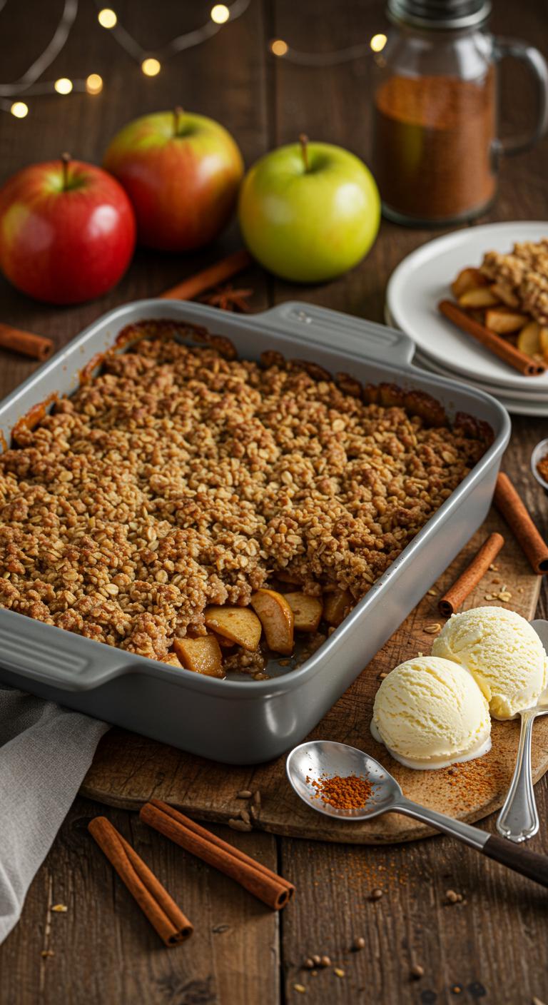 A cozy, cinnamon-scented apple crumble everyone can enjoy — warm, spiced fruit under a crunchy oat topping.