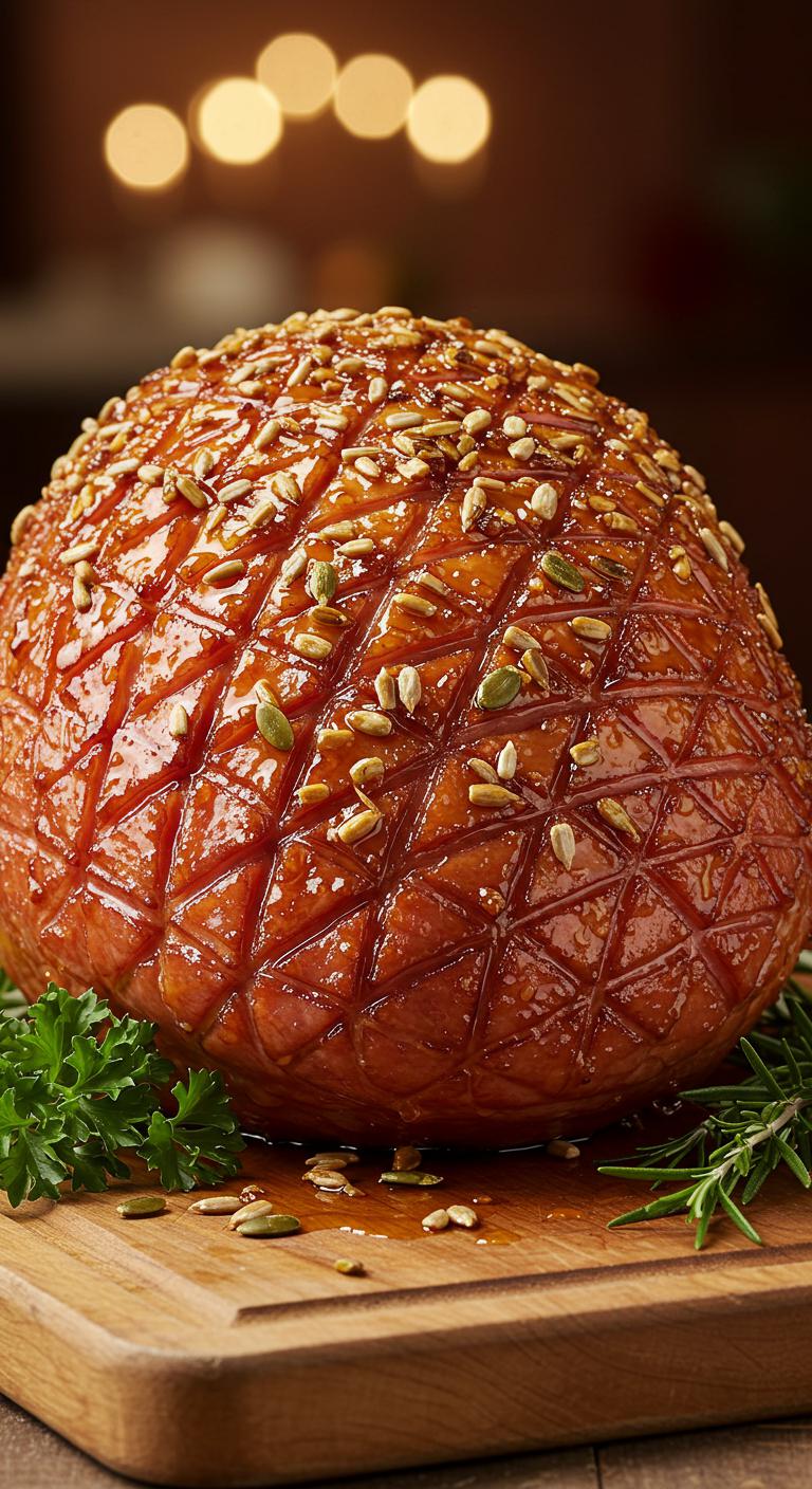 A holiday ham that’s sweet, shiny, and topped only with crunchy seeds — nut-free and festive.