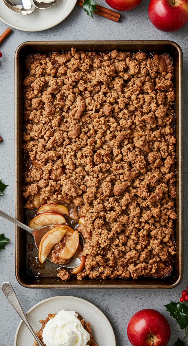 Sweet, spiced apples with a crunchy gingerbread crumble all baked on one sheet for easy holiday magic.