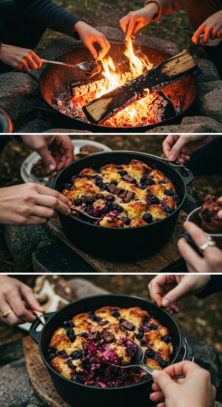 A gooey, chocolatey bread pudding studded with berries — perfect for cozying up around the campfire or the family table.