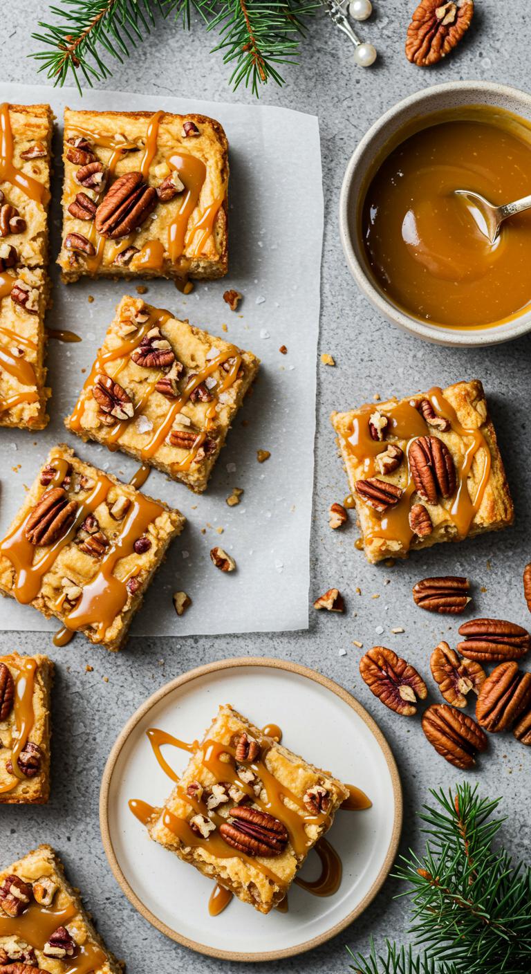 A rich, buttery cheesecake bar with crunchy pecans and a drizzle of gooey salted caramel—pure holiday indulgence.