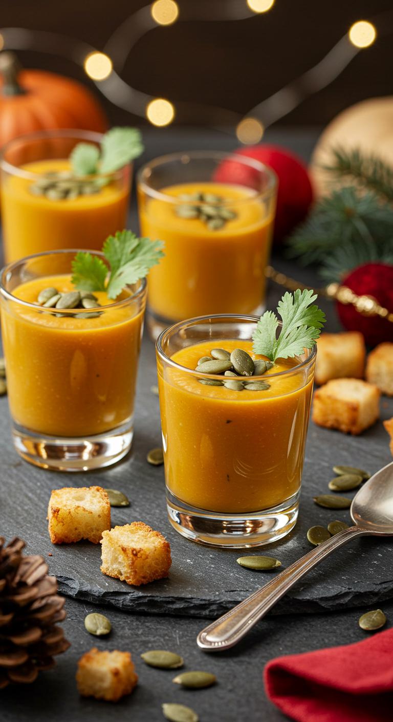A cozy, spiced pumpkin soup served in little shooters — perfect for sipping and sharing at your holiday party.