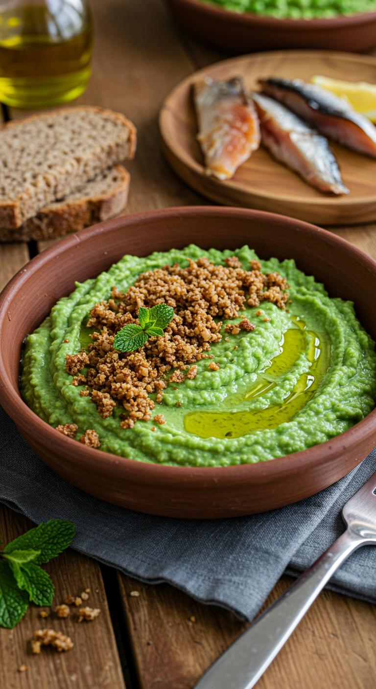 Bright, buttery pea purée lifted with fresh mint and crunchy rye crumbs — a cozy Nordic side or starter.